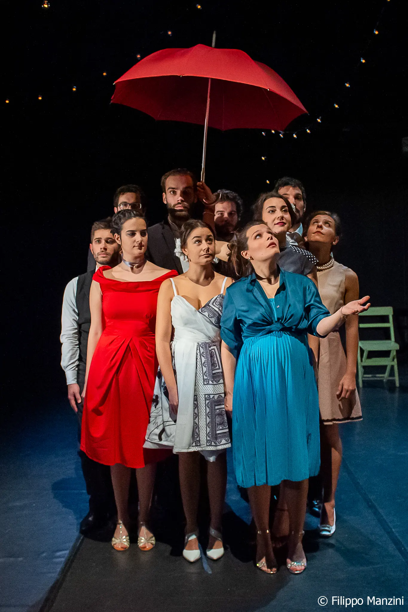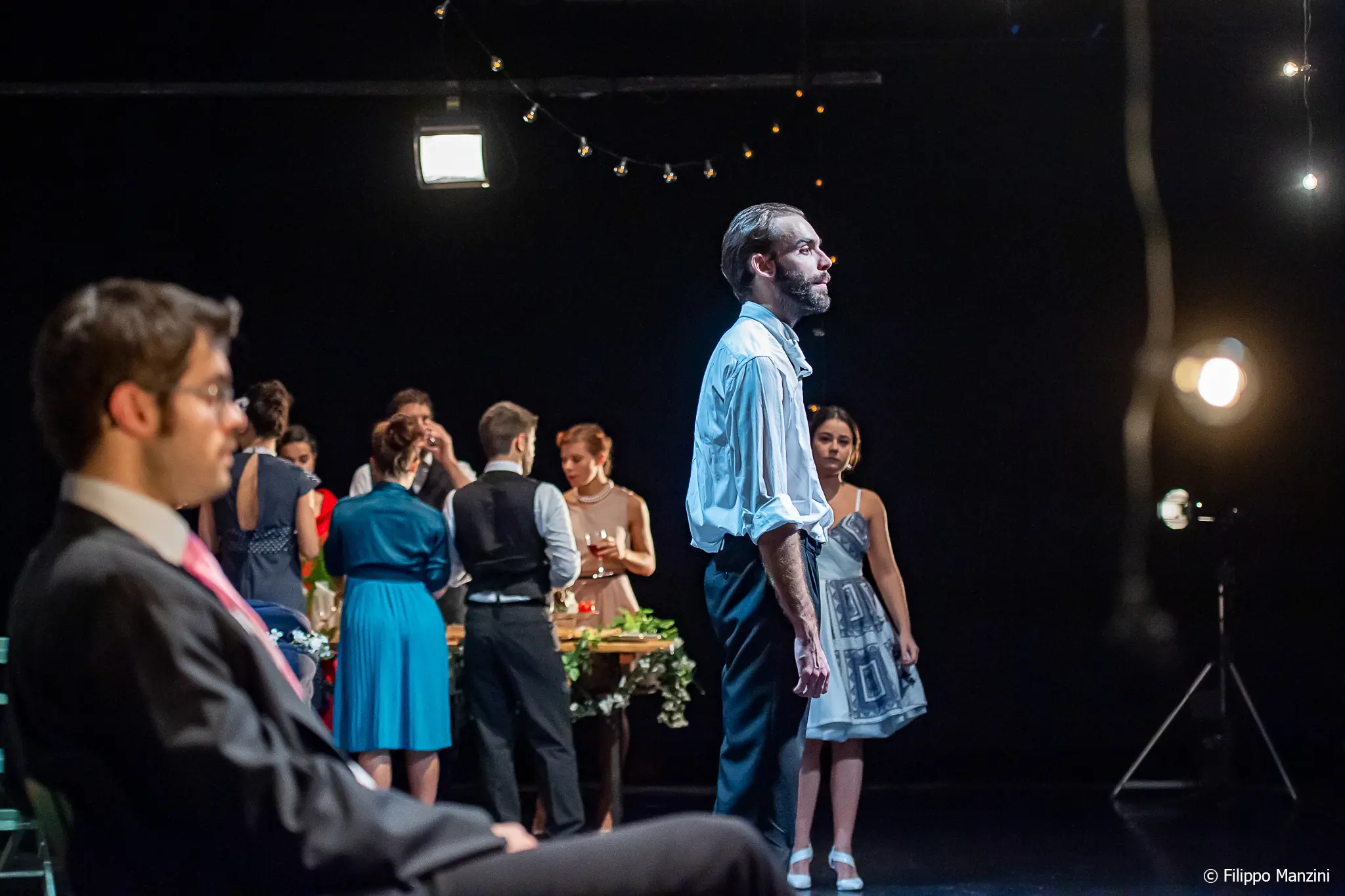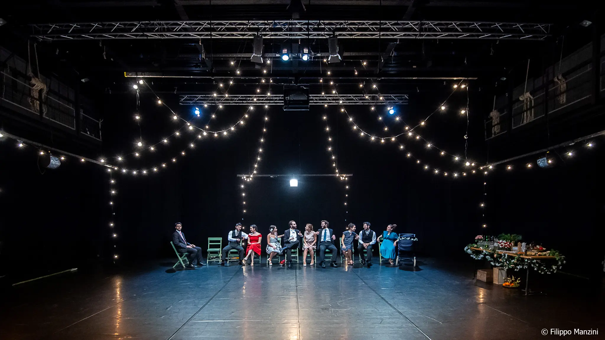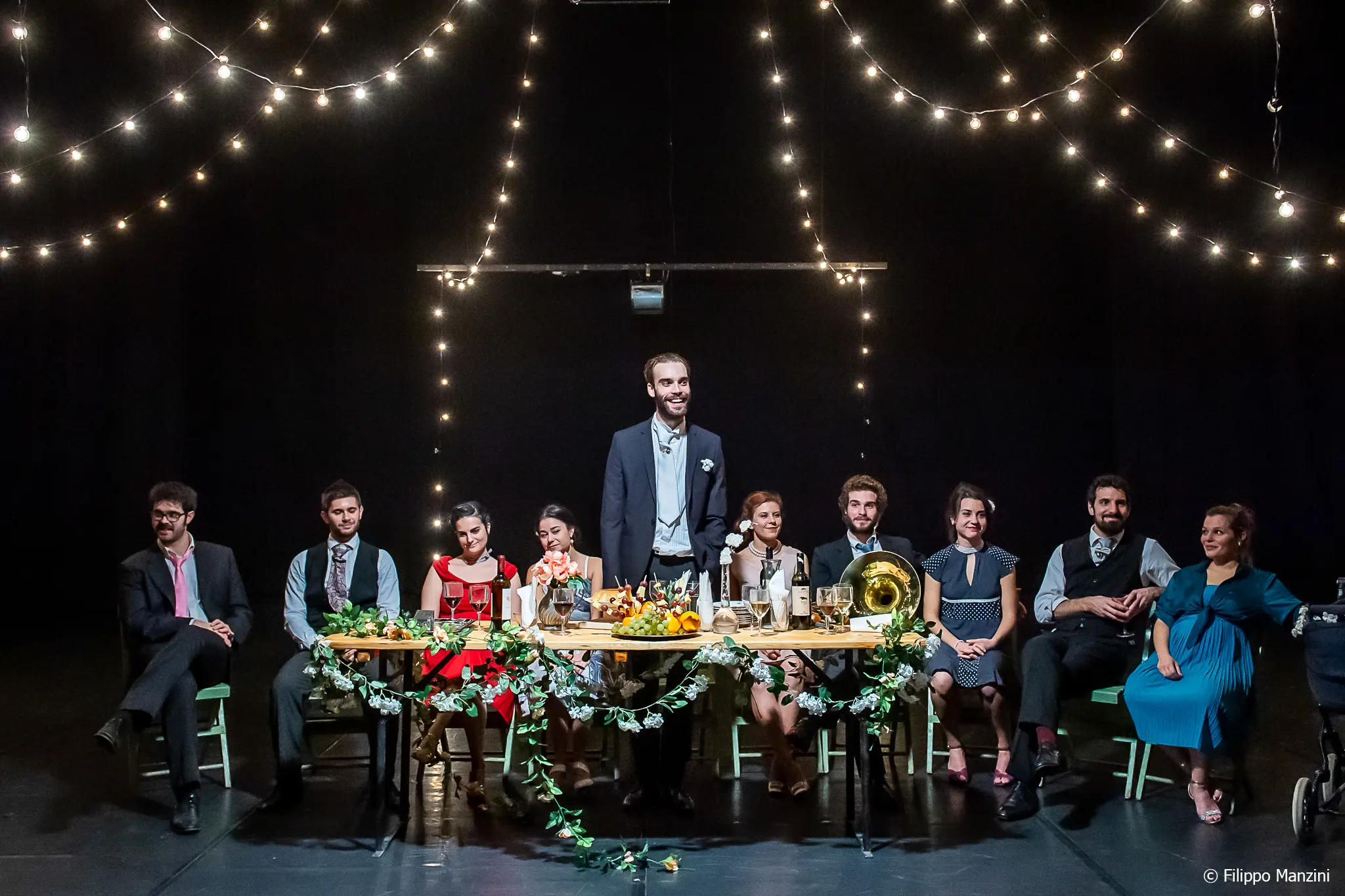 Un lungo tavolo imbandito in una sera d’estate, lampadine appese a un filo lo illuminano, intorno al tavolo gli invitati di un matrimonio in cui gli sposi hanno ormai cinquant’anni. Sia esso la ripetizione di un evento o l’evento stesso è spiegato dalla meccanica quantistica, non c’è passato, presente e futuro, c’è solo il qui e l’ora. Lo spaziotempo che è tra. Gli attori e le attrici dell’Amalgama tentano una sorta di salto generazionale nell’immaginare la propria esistenza in un’unica visione in cui si passa fluidamente dal passato al futuro e poi di nuovo al presente al passato al futuro senza soluzione di continuità.